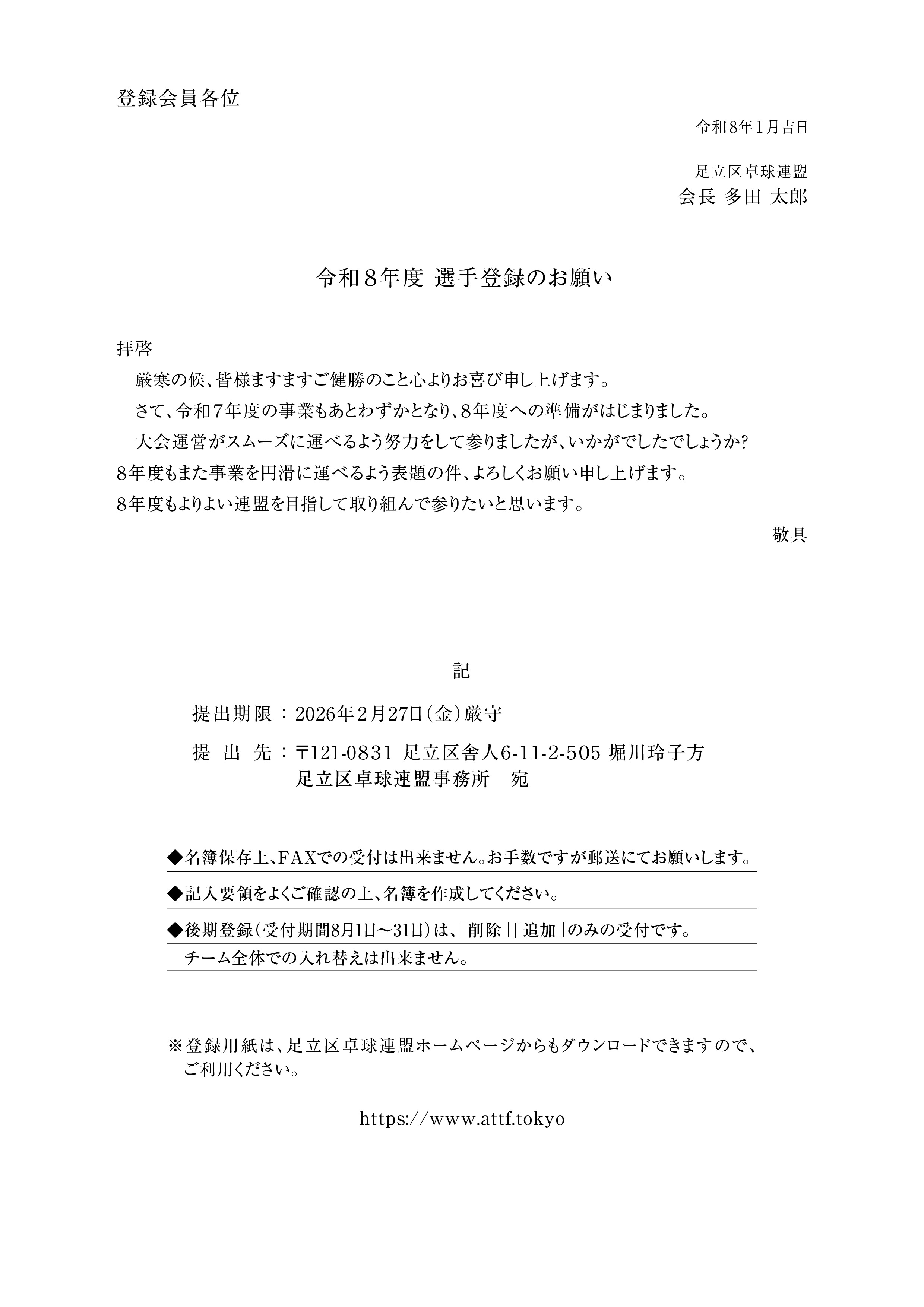 令和8年度足立区卓球連盟への選手登録をお願いいたします。